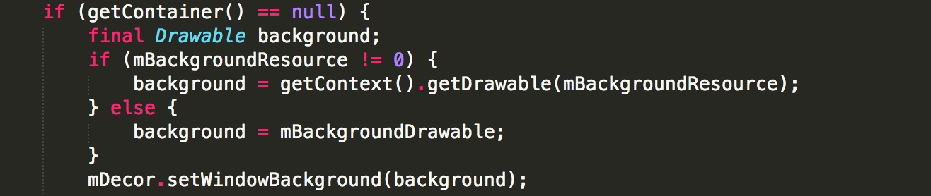 3、之后Activity:attach()方法会创建一个PhoneWindow对象,它就是界面,它有一个DecorView,调用setContentView()时会给配置DecorView,其中就会设置一个背景: