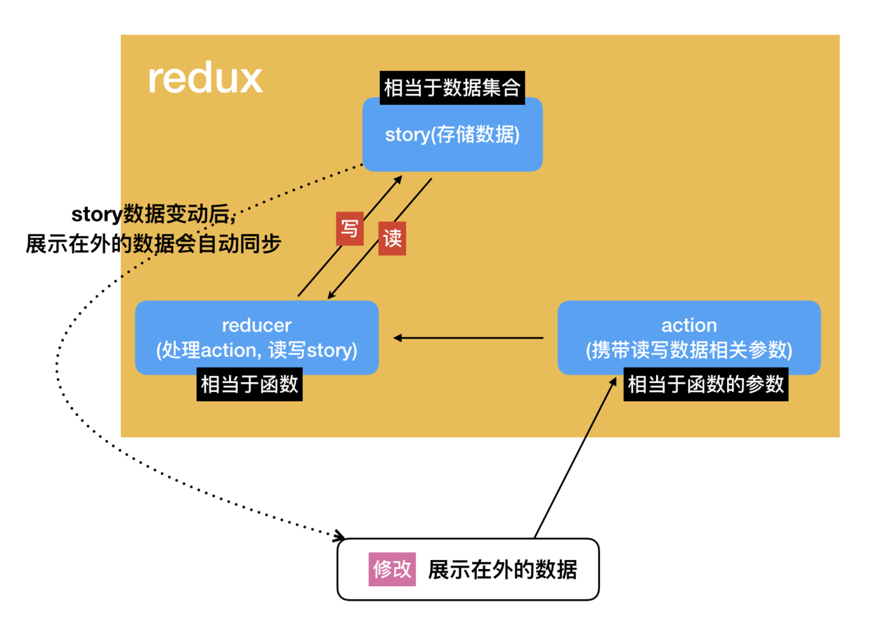 初见React时, 感觉Action, Reducer, Story的概念挺新颖, 但慢慢接触后发现, Aciton就是一个参数集合, Reducer就是一个处理Action的函数, Story就是一个数据集, 这样就变得很容易了