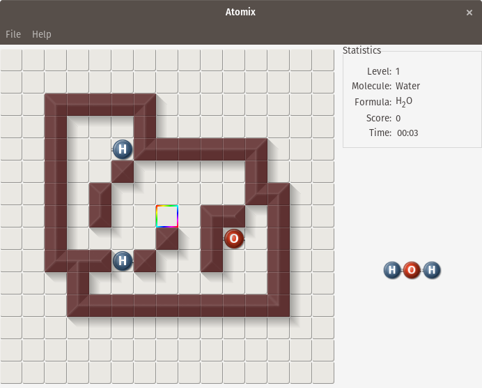 Atomix 是 1990 年在 Amiga、Commodore 64、MS-DOS 和其他平台发布的 Atomix) 益智游戏的开源克隆。Atomix 的目标是通过连接原子来构建原子分子。单个原子可以向上、向下、向左或向右移动,并一直朝这个方向移动,直到原子撞上一个障碍物——水平墙或另一个原子。这意味着需要进行规划,以确定在水平上构建分子的位置,以及移动单个部件的顺序。第一关是一个简单的水分子,它由两个氢原子和一个氧原子组成,但后来的关卡是更复杂的分子。
