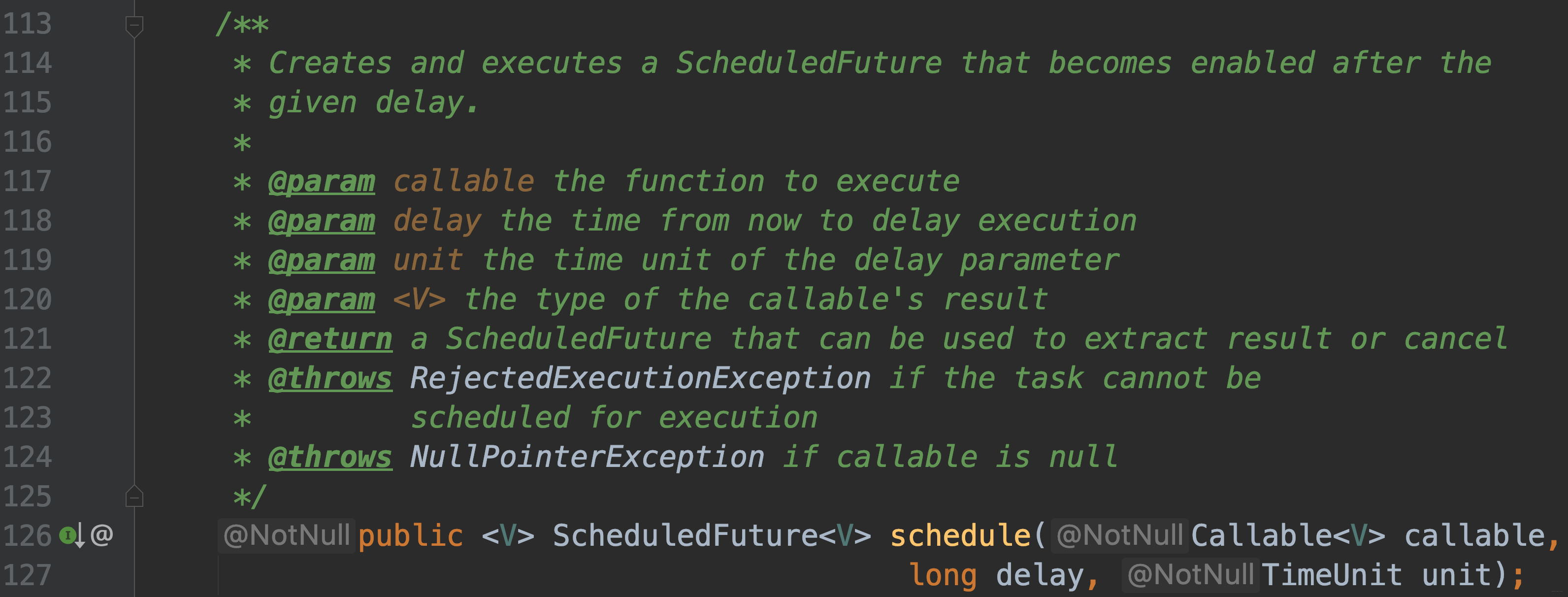 public ScheduledFuture<?> schedule(Runnable command, long delay, TimeUnit unit);
