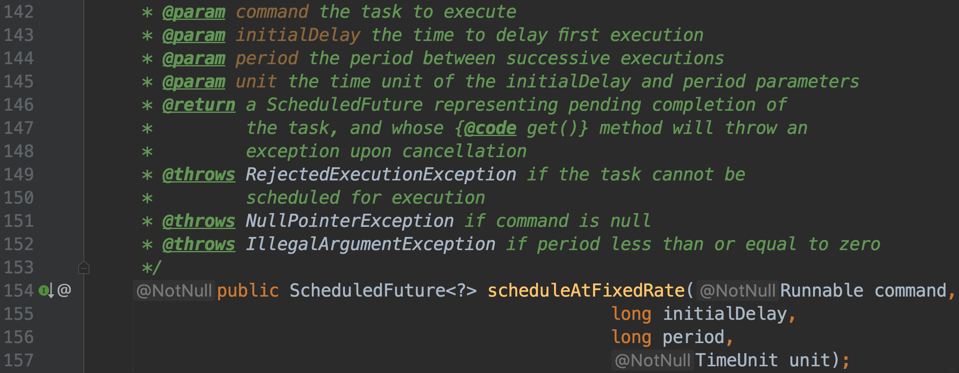 public ScheduledFuture<?> scheduleAtFixedRate(Runnable command, long initialDelay, long period, TimeUnit unit);