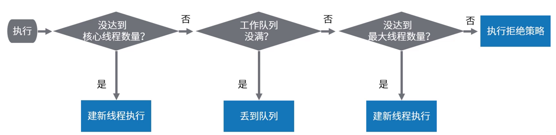 - 如果当前线程数已经达到 corePoolSize,那么将提交的任务添加到队列中,等待线程池中的线程去队列中取任务;