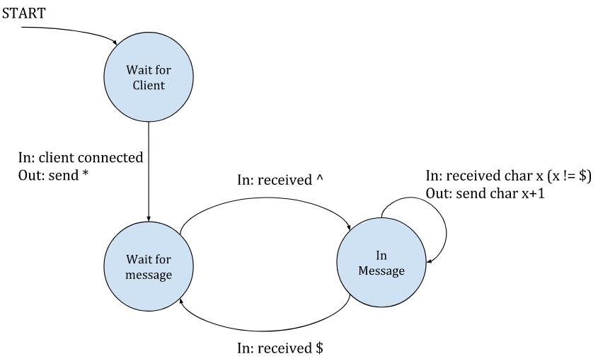 总之:服务器等待新客户端的连接;当一个客户端连接的时候,服务器会向该客户端发送一个 * 字符,进入“等待消息”的状态。在该状态下,服务器会忽略客户端发送的所有字符,除非它看到了一个 ^ 字符,这表示一个新消息的开始。这个时候服务器就会转变为“正在通信”的状态,这时它会向客户端回送数据,把收到的所有字符的每个字节加 1 回送给客户端^注1 。当客户端发送了 $ 字符,服务器就会退回到等待新消息的状态。^ 和 $ 字符仅仅用于分隔消息 —— 它们不会被服务器回送。