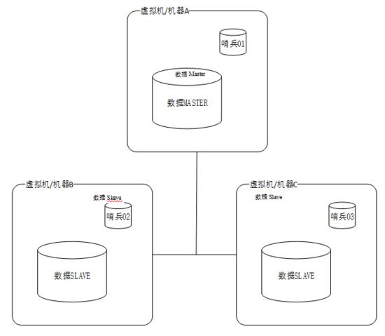 这里给出一个哨兵的通用部署方案。哨兵节点一般至少要部署3份,可以和被监控的节点放在一个虚拟机中,常见的哨兵部署如图所示。