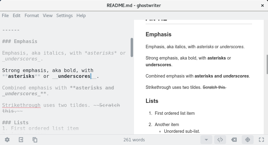Ghostwriter 是 Markdown 格式的文本编辑器,它有一个最小的界面。它以 HTML 格式提供文档预览,并为 Markdown 提供语法高亮显示。它提供了仅高亮显示当前正在编写的段落或句子的选项。此外,Ghostwriter 可以将文档导出为多种格式,包括 PDF 和 HTML。最后,它有所谓的“海明威”模式,其中删除被禁用,迫使用户现在智能编写,而在稍后编辑。