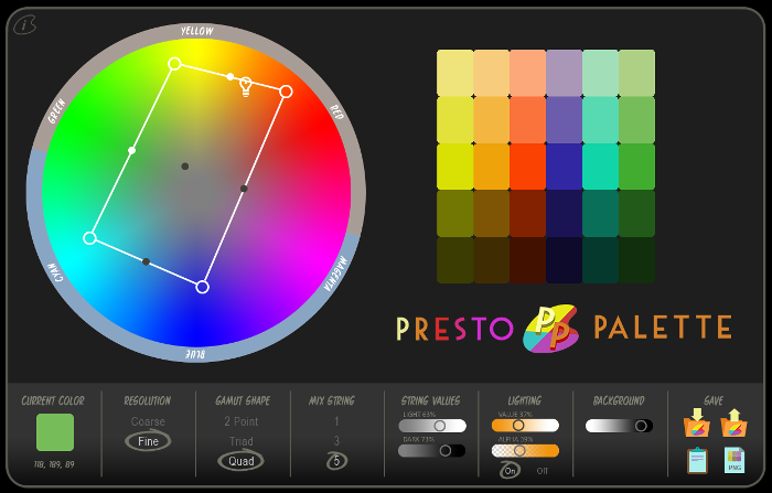 PrestoPeralette 是一款帮助创建平衡调色板的工具。PrestoPalette 的一个很好的功能是能够使用光照来影响调色板的亮度和饱和度。你可以将创建的调色板导出为 PNG 或 JSON。