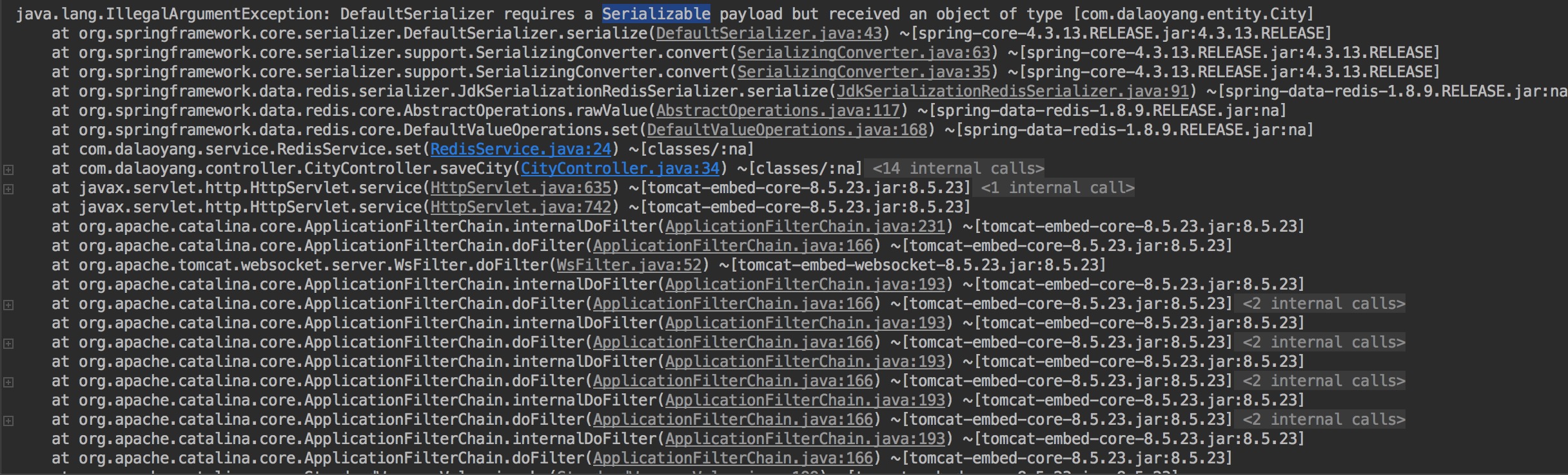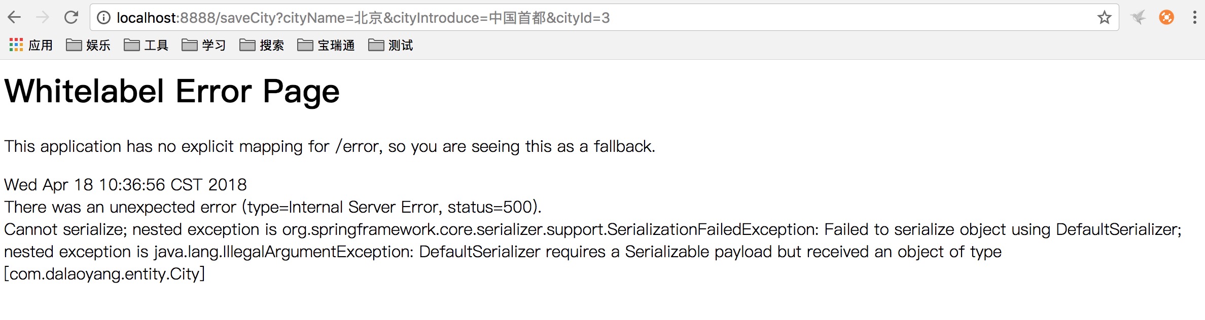 发现是实体类没有序列化,然后给City类序列化,然后访问http://localhost:8888/saveCity?cityName=北京&cityIntroduce=中国首都&cityId=18发现这次成功了。