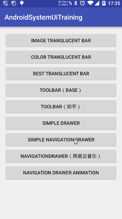 而现在再也不需要了,Google 推出的 ActionBarDrawerToggle 也能实现这样的效果了,具体查看我在 NavigationDrawerAnimationActivity 中的实现代码