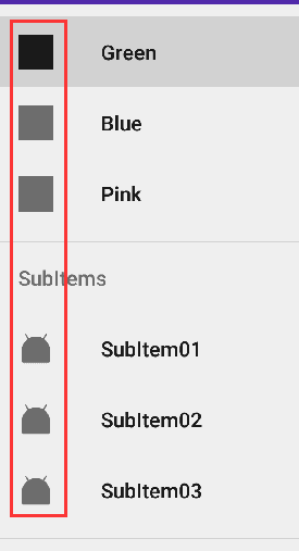 <?xml version="1.0" encoding="utf-8"?><menu xmlns:android="http://schemas.android.com/apk/res/android"> <group android:checkableBehavior="single"> <item android:id="@+id/item_green" android:icon="@mipmap/green" android:title="Green" /> <item android:id="@+id/item_blue" android:icon="@mipmap/blue" android:title="Blue" /> <item android:id="@+id/item_pink" android:icon="@mipmap/pink" android:title="Pink" /> </group> <item android:title="SubItems"> <menu> <item android:id="@+id/subitem_01" android:icon="@mipmap/ic_launcher" android:title="SubItem01" /> <item android:id="@+id/subitem_02" android:icon="@mipmap/ic_launcher" android:title="SubItem02" /> <item android:id="@+id/subitem_03" android:icon="@mipmap/ic_launcher" android:title="SubItem03" /> </menu> </item> <item android:title="SubItems"> <menu> <item android:id="@+id/subitem_04" android:icon="@mipmap/ic_launcher" android:title="SubItem04" /> <item android:id="@+id/subitem_05" android:icon="@mipmap/ic_launcher" android:title="SubItem05" /> <item android:id="@+id/subitem_06" android:icon="@mipmap/ic_launcher" android:title="SubItem06" /> </menu> </item></menu>