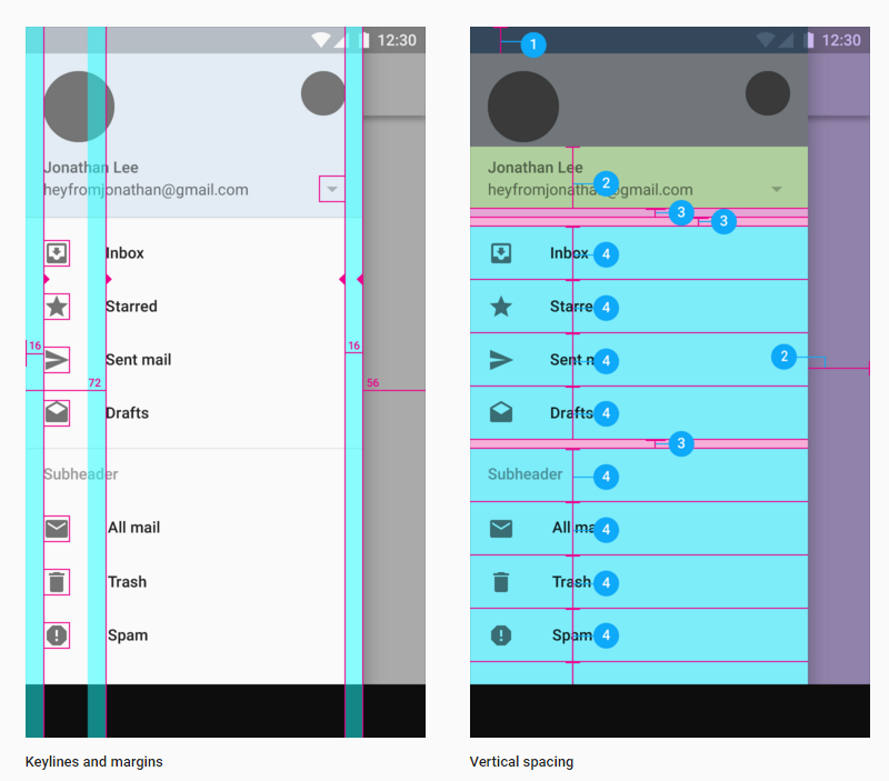 其次,是关于菜单相中图标大小和文字间距之类的设置,从 Google 的设计文档来看,