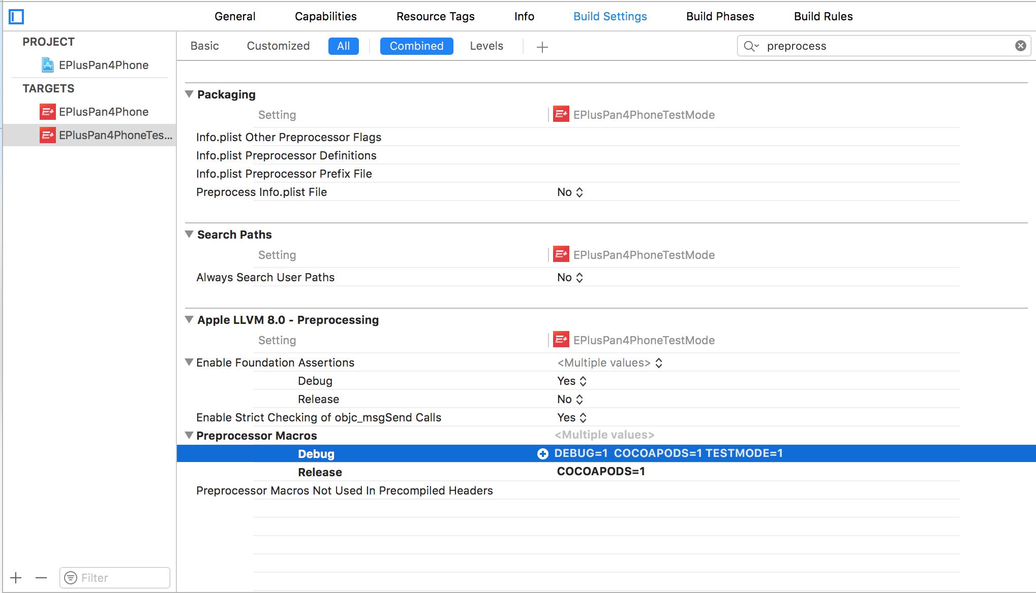 同样,我们同样也可以定义其他预处理变量,在XCode-选中Target-build settings中,搜索proprecess。然后点击图中蓝色的加号,可以分别为debug和release两种模式设置预处理宏。