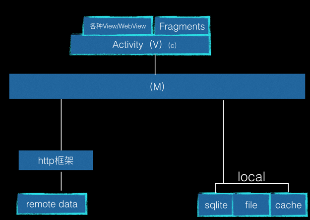 M:业务逻辑层划分出来专门处理数据。例如:数据的http请求,数据解析和储存等逻辑都封装在这一层。Activity 不直接和Http,Dao(数据访问对象层)直接有联系了,视图数据从此为路人。