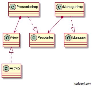 我们把每一层都抽象成一个接口,例如V层,我们定义一个接口为View(不要和Android API里的View弄混了),让后Activity为这个View的具体实现。每一层对另一层的依赖都是接口依赖,并不关心另一层的具体实现,每一层我们都可以写不同的实现,随时切换,这就意味着,有一天如果有一层不好用了,我们可以轻松的重写另一个实现来替换掉,而不是如履薄冰的修改。