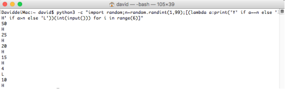 python3 -c "import random;n=random.randint(1,99);[(lambda a:print('Y' if a==n else 'H' if a>n else 'L'))(int(input())) for i in range(6)]”