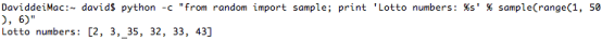 python -c "from random import sample; print 'Lotto numbers: %s' % sample(range(1, 50), 6)"
