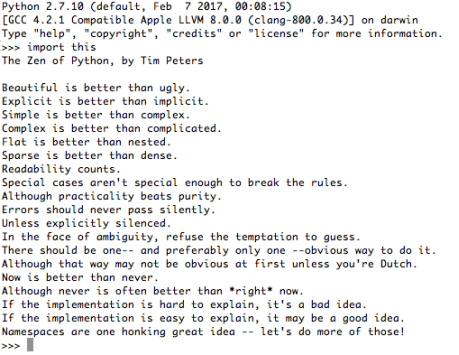 每次读到Python之禅的时候,总是情不自禁地陷入优美的意境不能自拔,恨不能随时随地都能拿来拜读?下面这行代码能够满足你的愿望: