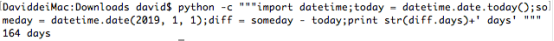 python -c """import datetime;today = datetime.date.today();someday = datetime.date(2019, 1, 1);diff = someday - today;print str(diff.days)+' days' “""