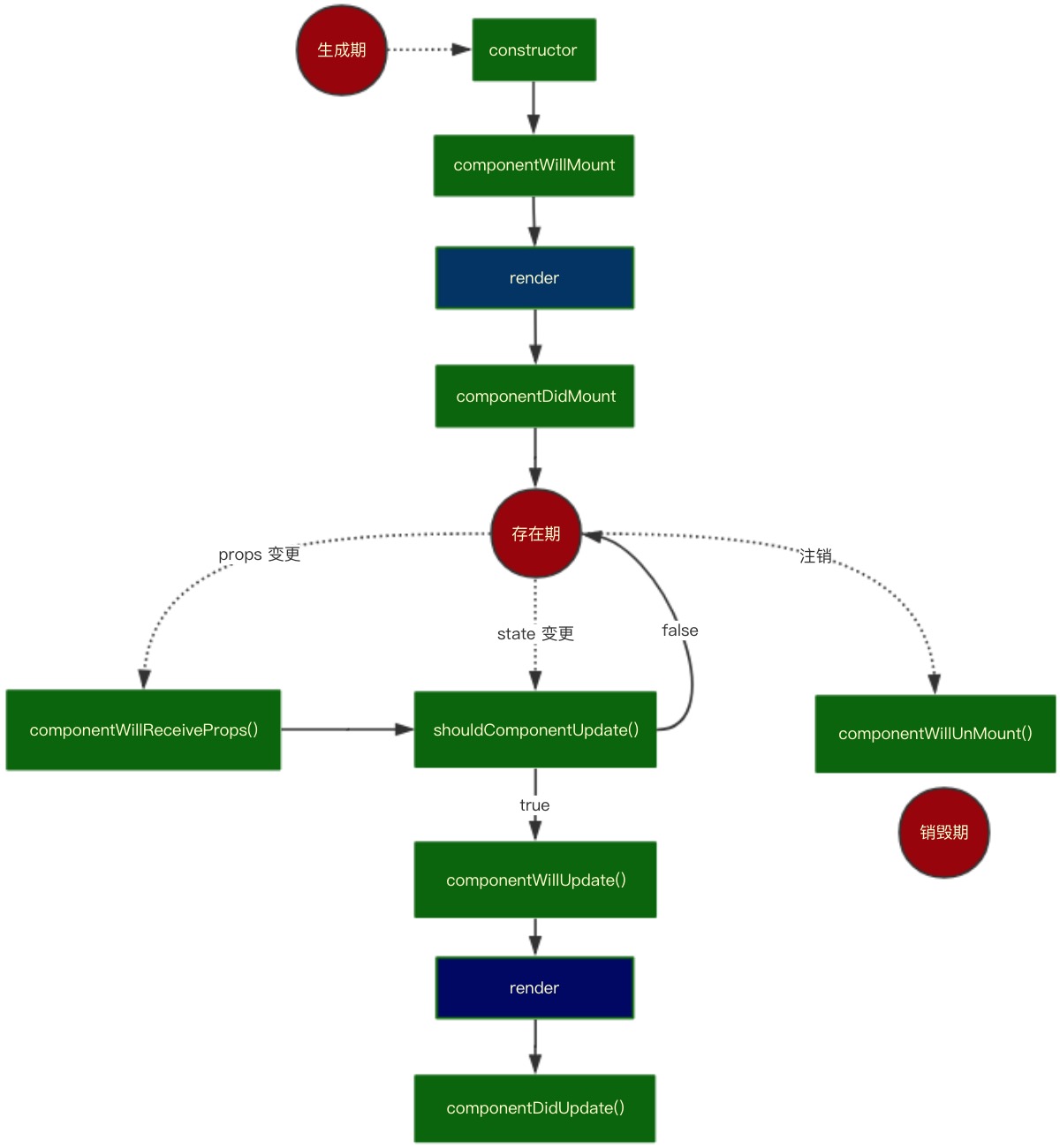 该流程图比较清晰地呈现了 react 的生命周期。其分为 3 个阶段 —— 生成期,存在期,销毁期。