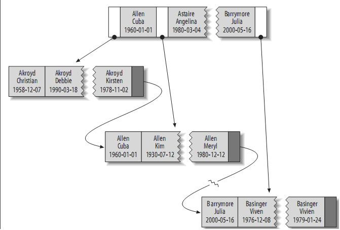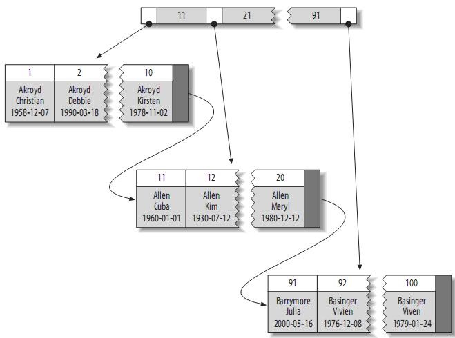 (4)匹配值的范围查询(Match a range of values):可以利用索引查找last name在Allen和Barrymore之间的人,仅仅使用索引中第1列。