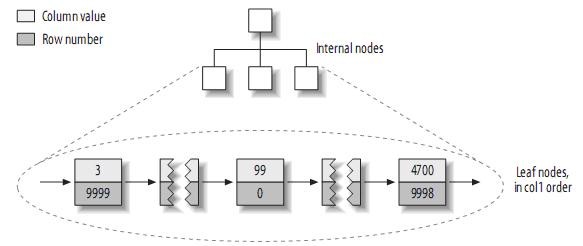 注:MyISAM不支持聚簇索引,索引中每一个叶子节点仅仅包含行号(row number),且叶子节点按照col1的顺序存储。