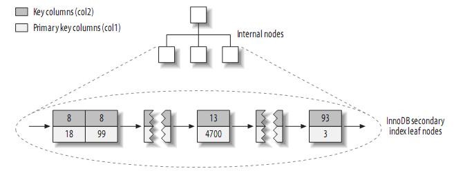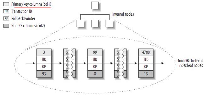 注:聚簇索引中的每个叶子节点包含primary key的值,事务ID和回滚指针(rollback pointer)——用于事务和MVCC,和余下的列(如col2)。