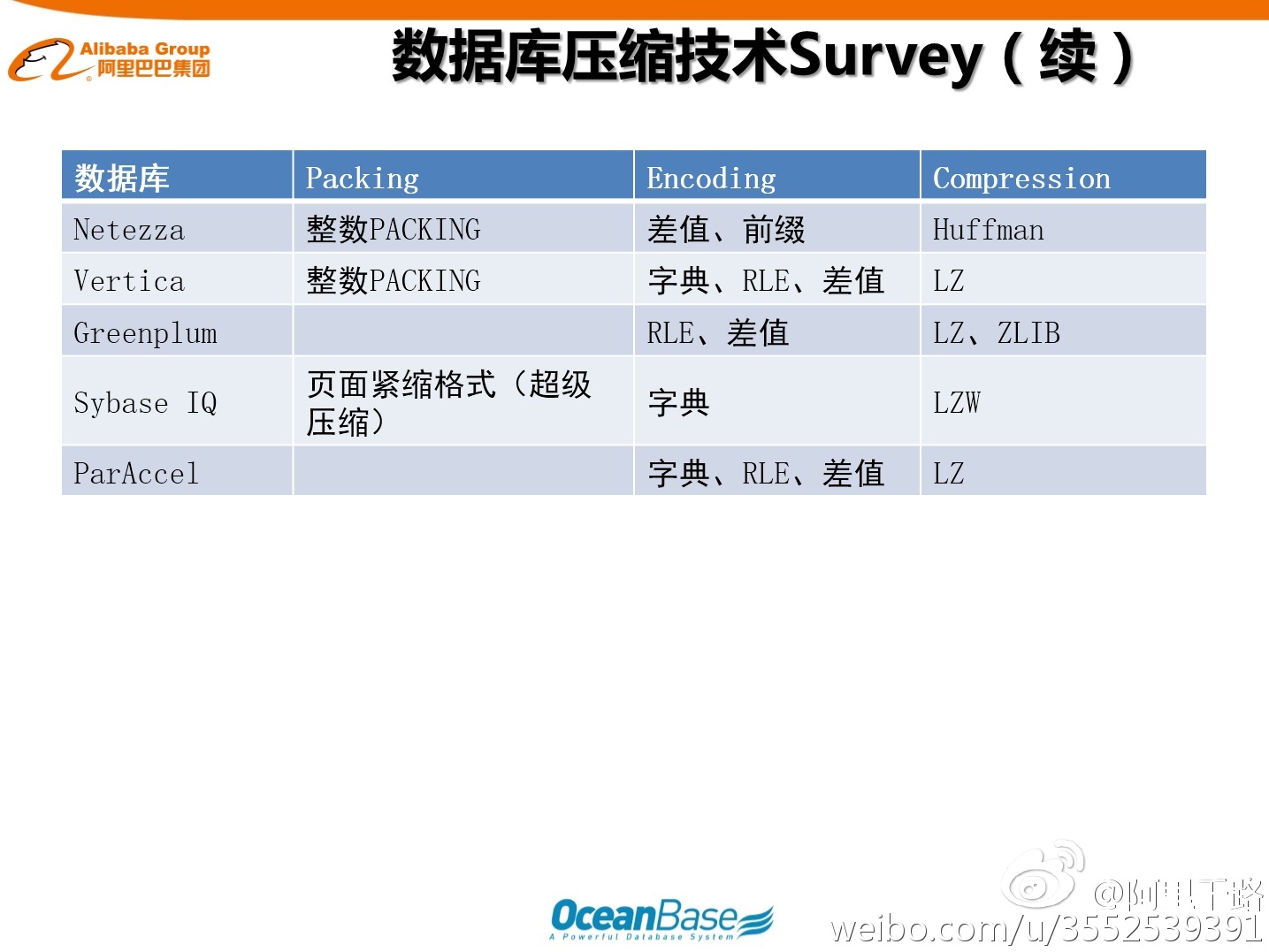 虽然是一种标配,但不同数据库对于数据库压缩技术的实现几乎各不相同,但总体上可以分为三个层次:1)Packing,比如消除小整数的前端0,消除CHAR的尾部空格等,这类压缩技术通常发生在OLTP系统中,粒度通常为字段级别,系统通常会提供正常和紧缩的两种存储格式;2)Encoding,也就是规则压缩,典型的方法包括字典、RLE、前缀、差值等,相关技术的细节,在参考资料里有详细的论述;3)Compression,也就是后端压缩,即直接使用通用的压缩算法,比如Snappy、Zlib、BZip等。