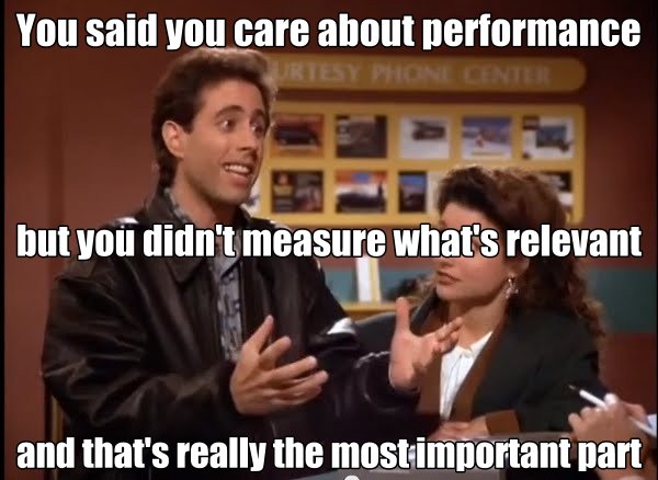 我希望现在应该清楚为什么基准测试通常是一个好主意,但是只对某个特定的级别有用,一旦你跨越了有用竞争useful competition的界限,你就会开始浪费你们工程师的时间,甚至开始损害到你的真实世界的性能!如果我们认真考虑 web 的性能,我们需要根据真实世界的性能来测评浏览器,而不是它们玩弄一个四年前的基准的能力。我们需要开始教育(技术)媒体,可能这没用,但至少请忽略他们。