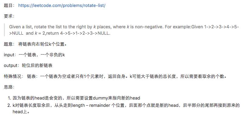 # Definition for singly-linked list.# class ListNode(object):# def __init__(self, x):# self.val = x# self.next = Noneclass Solution(object): def rotateRight(self, head, k): if head is None or head.next is None or k == 0: return head dummy = ListNode(0) dummy.next = head # 计算length,求余数,求step p = dummy #p从dummy开始,步数就可以和length保持一致 length = 0 while p.next: #p最后是走到尾部,而不是None,这样可以连接指向原head length += 1 p = p.next # 计算长度的同时,顺便把尾部指向原head p.next = head # 找到新head step = length - k % length while step > 0: #p从尾部开始,相当于从dummy开始,步数和step保持一致 p = p.next step -= 1 dummy.next = p.next p.next = None return dummy.next