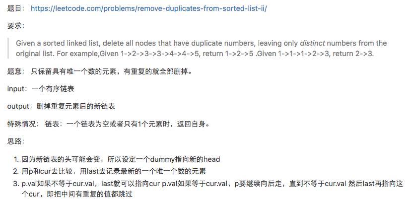 # Definition for singly-linked list.# class ListNode(object):# def __init__(self, x):# self.val = x# self.next = Noneclass Solution(object): def deleteDuplicates(self, head): if head is None or head.next is None: return head dummy = ListNode(0) dummy.next = head last = dummy cur = head while cur and cur.next: p = cur.next if p.val != cur.val: last.next = cur last = cur cur = p else: while p and p.val == cur.val: p = p.next cur = p last.next = cur return dummy.next