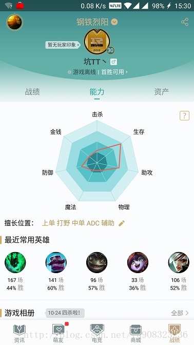 public static final String[] abilitys = {"击杀", "生存", "助攻", "物理", "魔法", "防御", "金钱"};    //每个能力的值,范围0~100,单位%
