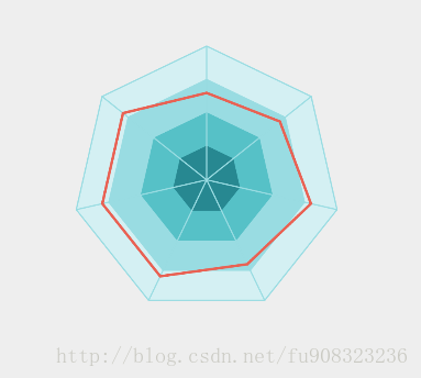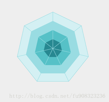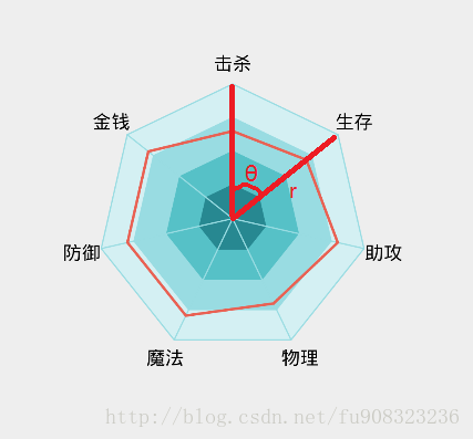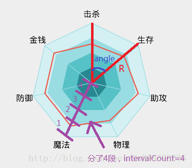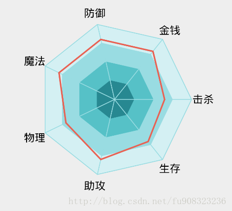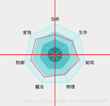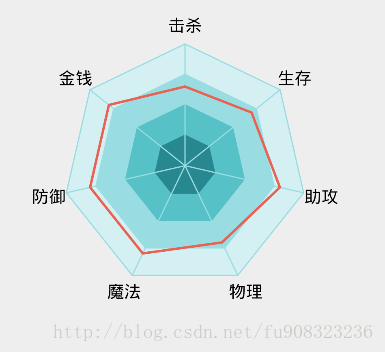 通过数学几何知识计算出每一圈(多边形)的顶点坐标,然后用Path这个类就能绘制出多边形,一层一层的绘制,就出现了颜色不同的圈,再通过能力值和所在的能力对应的半径计算出这个能力点在这条半径上所在的位置,也就是坐标,然后通过path就能绘制出能力的线。至于文字的话就是最外圈的顶点半径延长一点所在的坐标点绘制文字即可。