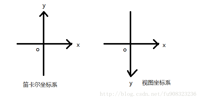 最后需要注意一点的是,数学上的笛卡尔坐标系(直角坐标系)的如上面的图,Y轴的正向是向上的,而安卓中的视图坐标系的Y轴是向下的。