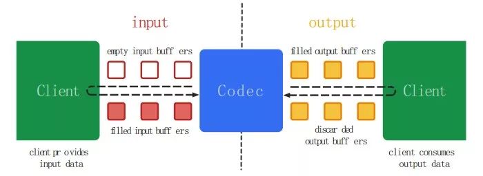 MediaCodec是Google在Android API 16之后推出的用于音视频编解码的一套偏底层的API,可以直接利用硬件以加速视频的编解码处理。MediaCodec的概念中,一般而言,编解码器处理输入数据并生成输出数据。它异步处理数据并使用一组输入和输出缓冲区。在简单的层面上,需要请求(或接收)一个空输入缓冲区,填充数据并将其发送到编解码器进行处理。编解码器使用数据并将其转换为其空的输出缓冲区之一。最后,你请求(或接收)一个填充的输出缓冲区,消耗其内容并将其释放回编解码器。