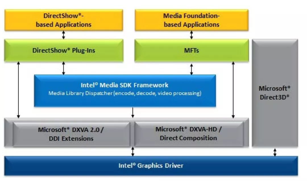 Intel提供的Media SDK,本质是一套跨平台的加速方案,它在Windows/Linux上提供了相同的API,底层则分别使用了Windows上的DXVA2和Linux上的VAAPI接口,以Windows平台上为例,它的基本结构框图如下: