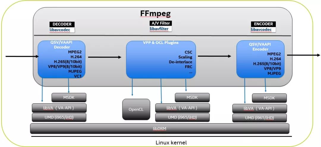 在Windows平台,如果你想在Intel 平台上执行编码相关的事务, Media SDK基本上是唯一的选择。当然,如果你更偏向FFmpeg的API,可以使用FFmpeg QSV/Media SDK的方式;而在Linux平台,FFmpeg VA-API与FFmpeg QSV/Media SDK 接口大部分功能重合,更多的区别可能在于软件灵活度和开放程度的考量。一般说来,FFmpeg VA-API提供了更大的灵活度,对于有开发能力或者想二次定制的客户更加的友好一些。从FFmpeg的角度看,这两者在FFmpeg框架内的最大不同点在于: FFmpeg VA-API是以Native CODEC的方式直接实现与FFmpeg内部,而FFmpeg QSV集成Media SDK的方式,非严格的类比则类似于FFmpeg 集成libx264 这样第三方库的方式,需要依赖Media SDK,而FFmpeg VA-API则并不依赖第三方的库,其CODEC的实现直接位于FFmpeg代码库自身。另外,需要提及的另外一件事情是,Media SDK开放了部分功能,其代码Repo在: