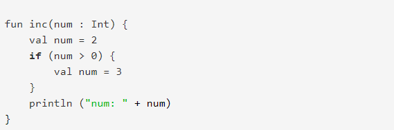 当调用inc(1)会输出什么呢?在Kotlin中,方法参数是不变的值,所以你不能改变num这个方法参数,这个输出结果是“2”;