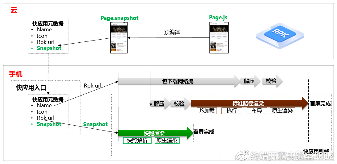 当快应用首次加载启动时,包的下载地址与快照文件一起传给快应用引擎。引擎在请求下载快应用包的同时,加载解析快照,渲染出首屏。当包下载完成后,标准的渲染流程在快照的基础上继续执行。