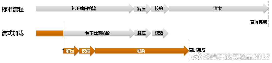 流式加载是将启动所需要的资源在网络流中优先传输,这部分资源传输完后并进行解压与校验,首页的渲染就可以立即执行了。网络流的后续传输仍在持续进行直至下载过程全部完成。首次渲染所需资源往往很小,所以流式加载能明显降低下载延时,包越大效果越明显。流式加载需要解决如下问题: