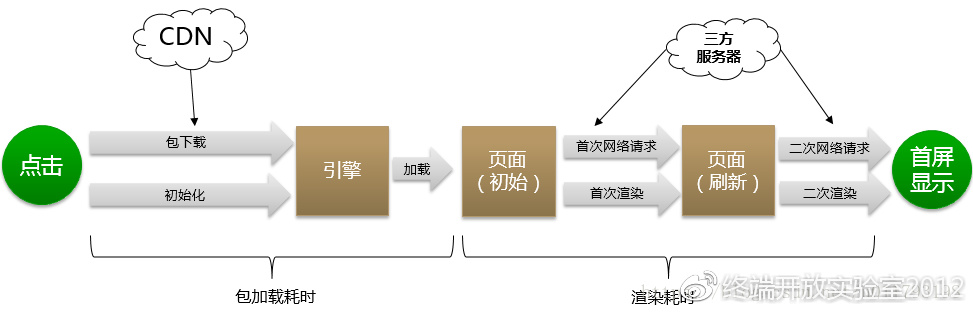 2)页面渲染包括JavaScript加载、页面与JavaScript框架逻辑的执行、布局的运算,最终到原生UI控件的绘制。其中,页面内逻辑执行时会有一次或多次的到应用自己的三方服务器的网络请求,请求返还的数据驱动页面的再次渲染,直至首屏内容完全展示。这里网络请求、JavaScript执行、排版与绘制并非简单的串行关系,而是并行化地交织在一起影响着整个页面的渲染性能,并与页面设计的逻辑、网络状况与设备运行的状态强相关。