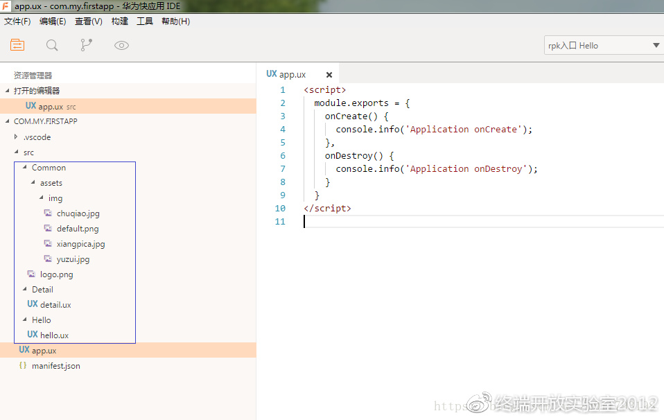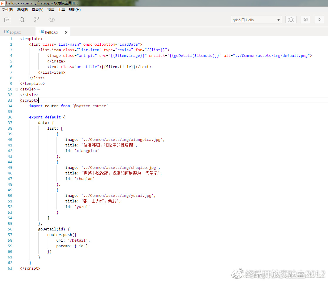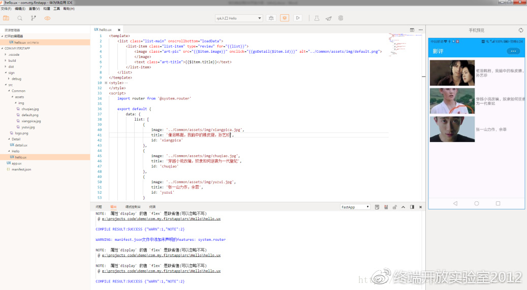 开始具体的编码了。这里设计了一个简单的影评应用业务逻辑:应用的首页是电影的列表,点击进去以后,可以查看到相应影评。首先是首页电影列表的开发,我们直接将模板中的hello.ux为影评首页,然后新增一个影评的详细子页面,命名为detail.ux。将所需的图片资源放在Common目录下。影评文本写在ux源码文件里。这些动作可以通过在资源管理区使用右键中完成。