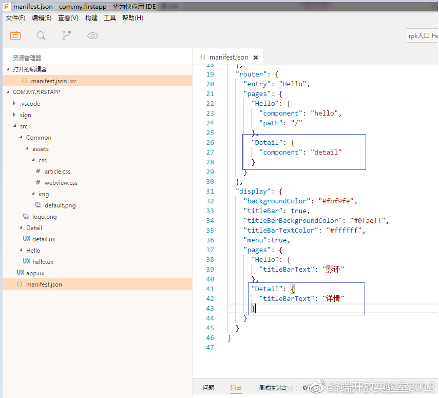 接下来配置页面与路径,参考标准规范,在工程的manifest.json文件的router和display,添加detail页面,把Hello,改成“影评”,同时添加“详情”。