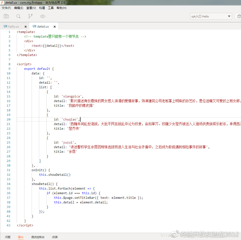 完成影评列表的首页开发,下面就是具体影评的详细页面了。detail.ux作为详情页,这里使用简单text组件显示文本,当前也可以做更多的样式,可以添加图片或电影视频片段等等。我们这里直接写几个影评信息,就完成了详情页的开发了。