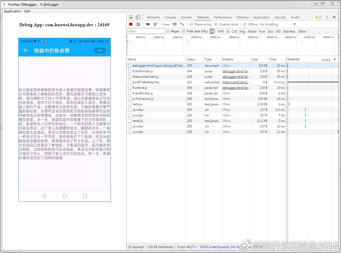 编码已经基本完成了,下面试一下调试功能,快应用IDE的调试功能提供了Source断点调试、Element元素审查、NetWork网络抓包、Log分析等特性。点击调试按钮(快捷键F5),启动调试进程,如下图,也是典型的DevTools方式,比较常用,这里尝试了断点调试与Inspect。