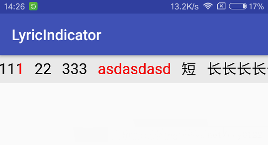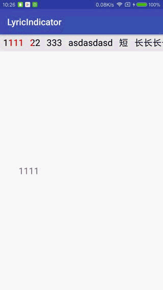 <com.example.lyricindicator.LyricIndicatorandroid:id="@+id/indicator"android:layout_width="match_parent"android:layout_height="wrap_content"android:background="#11000000"app:item_padding="7dp"app:text_size="20sp"app:default_color="#000000"app:changed_color="#ff0000"> </com.example.lyricindicator.LyricIndicator>12345678910