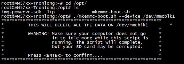 固化Linux系统到eMMC的脚本文件为光盘资料“Shell\mkemmc-boot.sh”,广州创龙提供的文件系统已将该脚本文件存放到“/opt”目录下。进入文件系统的“/opt”目录运行脚本即可自动固化Linux系统到eMMC,该脚本自动将eMMC格式化为boot分区和rootfs分区。