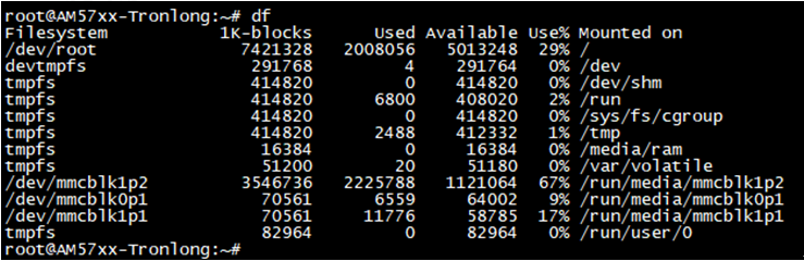 使用SD卡启动开发板,进入开发板文件系统执行如下指令,查看系统详细挂载信息: