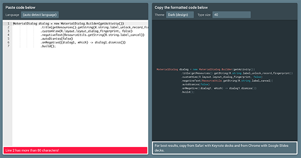 作为开发者和团队领导,我们经常需要做技术演讲或者向其它开发者分享一段很酷的代码。Roman Nurik的这个在线工具可以为代码增加高亮效果,把乏味的代码转成各种主题的高亮效果。