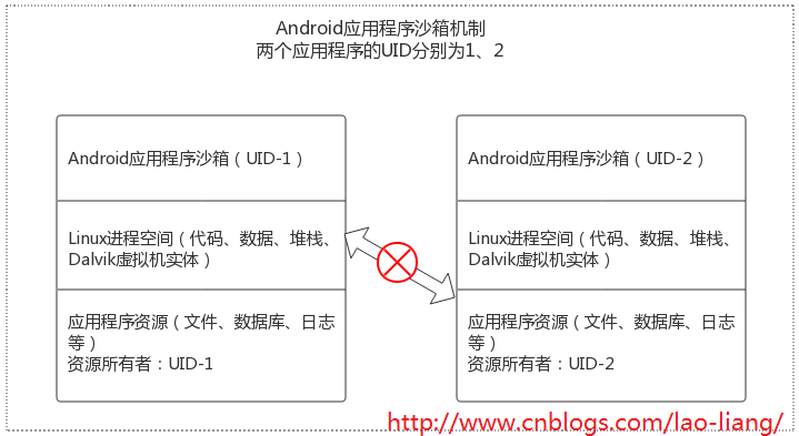 进程沙箱隔离机制,使得Android应用程序在安装时被赋予独特的用户标识(UID),并永久保持。应用程序及其运行的Dalvik虚拟机运行在独立的Linux进程空间,与其它应用程序完全隔离。