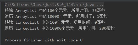 System.out.println("移除 LinkedList 中的100个元素,所用时间:" + (endTime - startTime) + "毫秒"); //开始时间