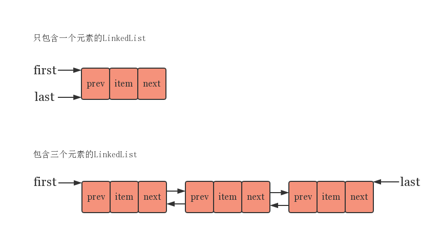 当中的成员变量 first 和 last 分别用于指向链表的头部和尾部结点,因此 LinkedList 的数据结构图是类似于这样的
